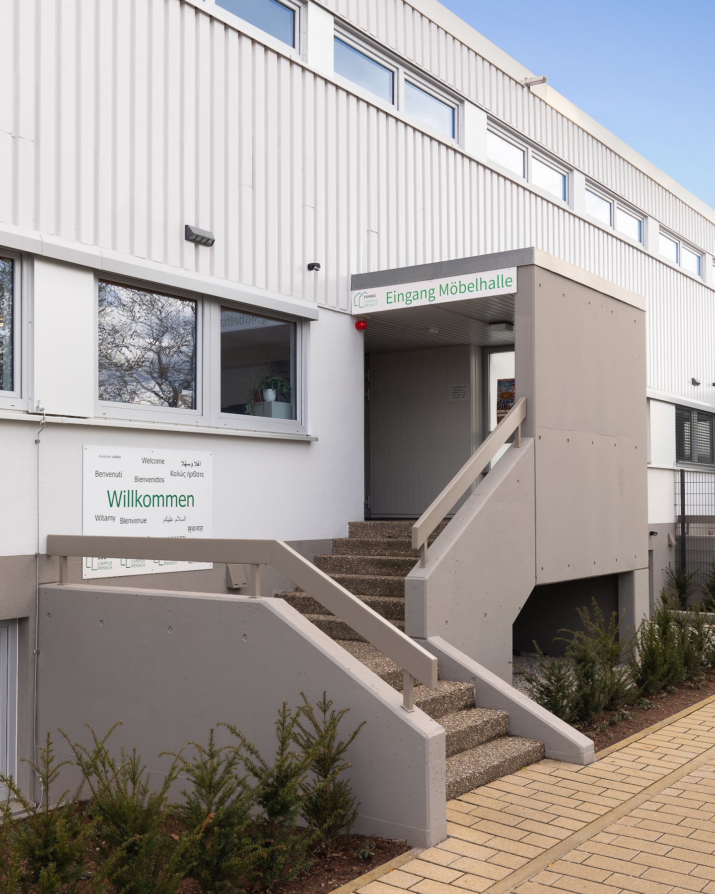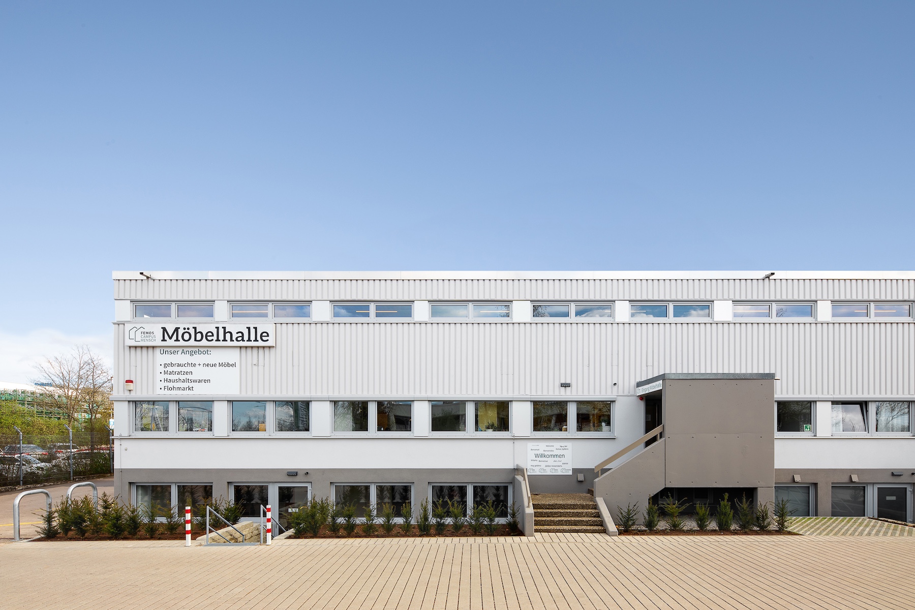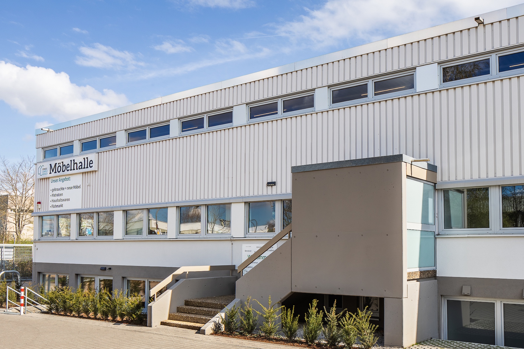 Sanierung des Bestandsgebäudes mit Verkaufshalle für Gebrauchtmöbel, Lager, Werkstatt und Betriebswohnungen aus den 1970 er Jahren.